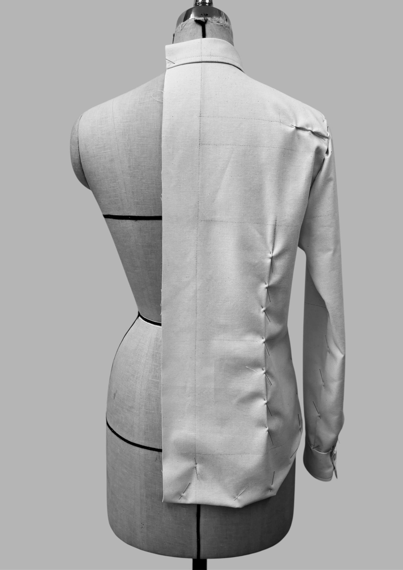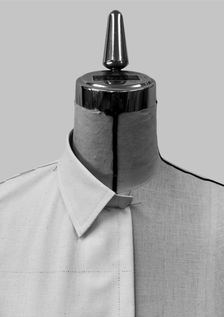 最低限のゆとりを入れたタイトシルエットの基本シャツを、前後丈、前後衿みつ